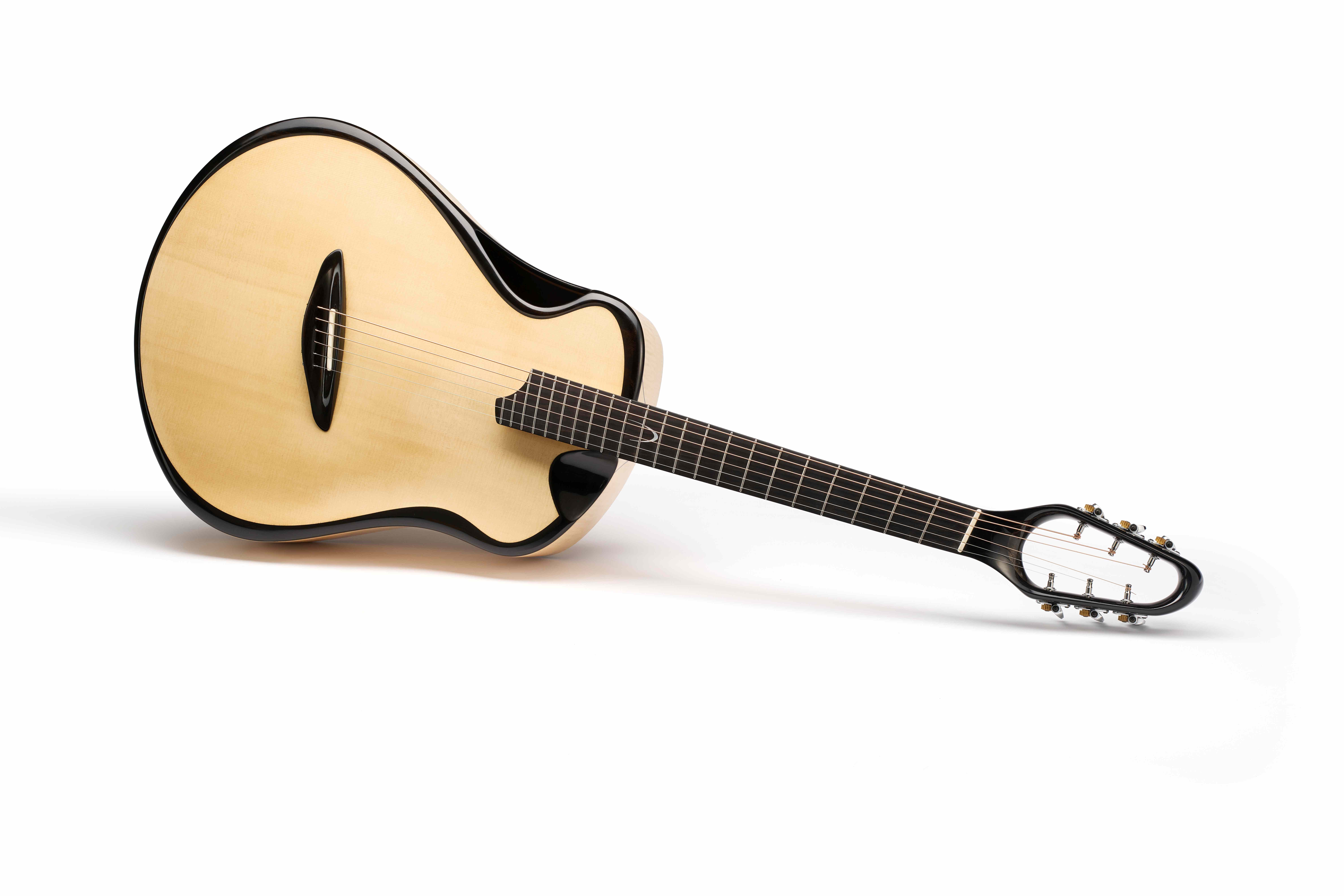Durch den konkave Ausschnitt am Boden fühlt sie sich die Gitarre viel komfortabler und schmaler an als traditionell gebaute Instrumente, während ein relativ großes Korpusvolumen beibehalten wird.